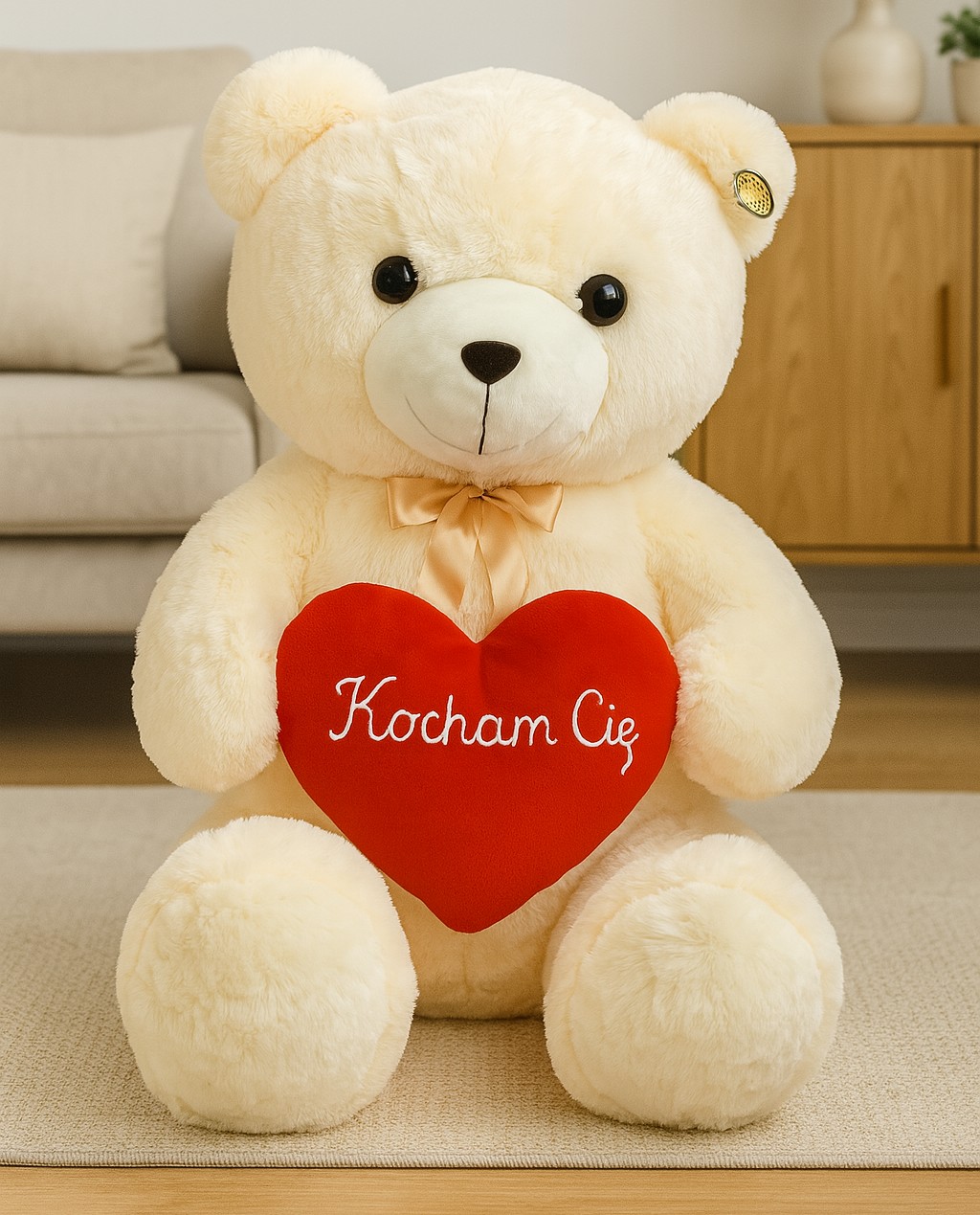 Wykonany z miękkiego, przyjemnego w dotyku materiału, trzyma w łapkach czerwone serce z napisem "Kocham Cię", co czyni go wyjątkowym symbolem miłości. Jego przyjazny wygląd, duże oczy i aksamitna kokardka sprawiają, że doskonale sprawdzi się jako romantyczny upominek na Walentynki, rocznicę lub po prostu, by wyrazić uczucia. Miś może stać się także uroczą dekoracją sypialni lub salonu. To nie tylko zabawka, ale prawdziwy strażnik ciepłych emocji.