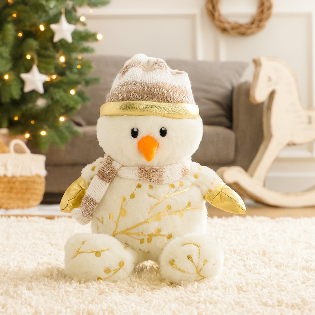 Bałwanek ma delikatne, kremowo-białe futerko ozdobione złotymi motywami gałązek, które pięknie mienią się w blasku choinkowych lampek. Jego uśmiechnięty pyszczek i pomarańczowy nos marchewka natychmiast poprawiają humor, a ciepły szalik i czapeczka dodają mu uroku. To idealny kompan na długie zimowe wieczory – wystarczy jeden uścisk, by poczuć świąteczną radość!