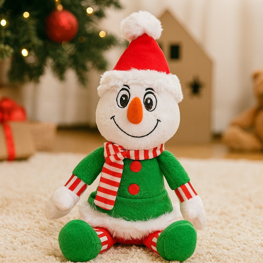 Poznaj uroczego Bałwanka, który nawet w środku zimy potrafi rozgrzać serca! Ten pluszowy przyjaciel to prawdziwy ambasador świątecznej radości. Ubrany w elegancki czarny kapelusz, czerwone rękawiczki i szalik w zielone paski, wygląda jak prosto z bożonarodzeniowej bajki. Na jego miękkim brzuszku widnieje napis „Merry Christmas”, przypominający, że święta to czas uśmiechu i dobrej zabawy.