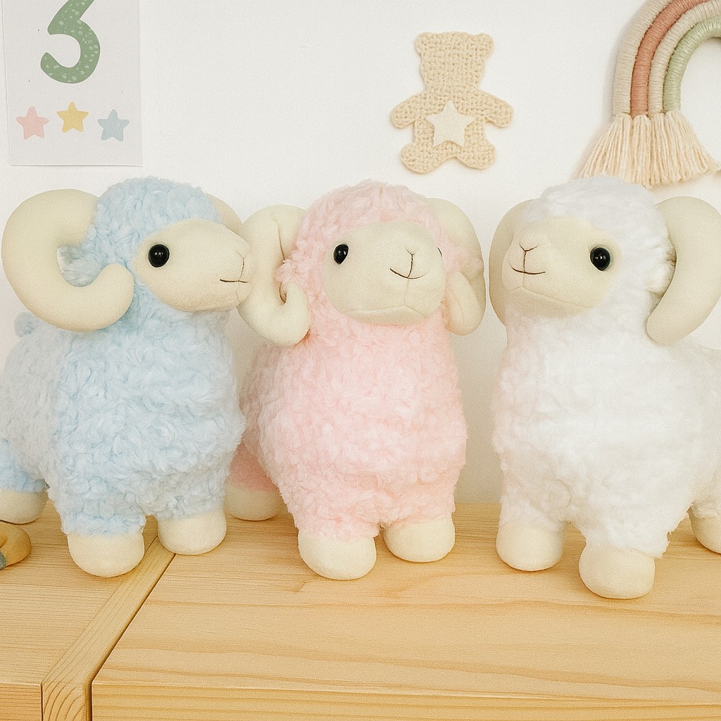 Baranek został wykonany z wyjątkowo przyjemnego w dotyku, aksamitnego materiału o strukturze przypominającej wełnę. Jego delikatne wypełnienie sprawia, że jest lekki i idealny do przytulania. Maskotka ma starannie wykończone detale – błyszczące oczka, miękkie rogi i lekko uśmiechnięty pyszczek. Wszystkie elementy są bezpiecznie przymocowane, dzięki czemu baranek nadaje się nawet dla najmłodszych użytkowników.
