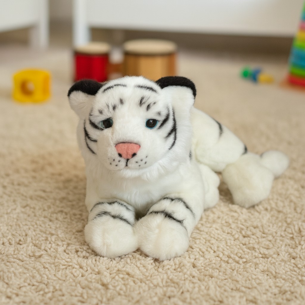 Poznaj uroczego białego tygrysa – maskotkę, która zachwyca zarówno dzieci, jak i dorosłych! Ta wyjątkowa pluszowa zabawka o długości 30 cm to idealny towarzysz do zabawy, przytulania i wspólnego zasypiania. Jej miękka, puszysta sierść w kolorze śnieżnej bieli, kontrastująca z czarnymi paskami, nadaje jej wyjątkowego uroku i realistycznego wyglądu. Różowy nosek, czarne uszy i wyraziste niebieskie oczka dodają jej charakteru i sprawiają, że wygląda przyjaźnie i słodko.