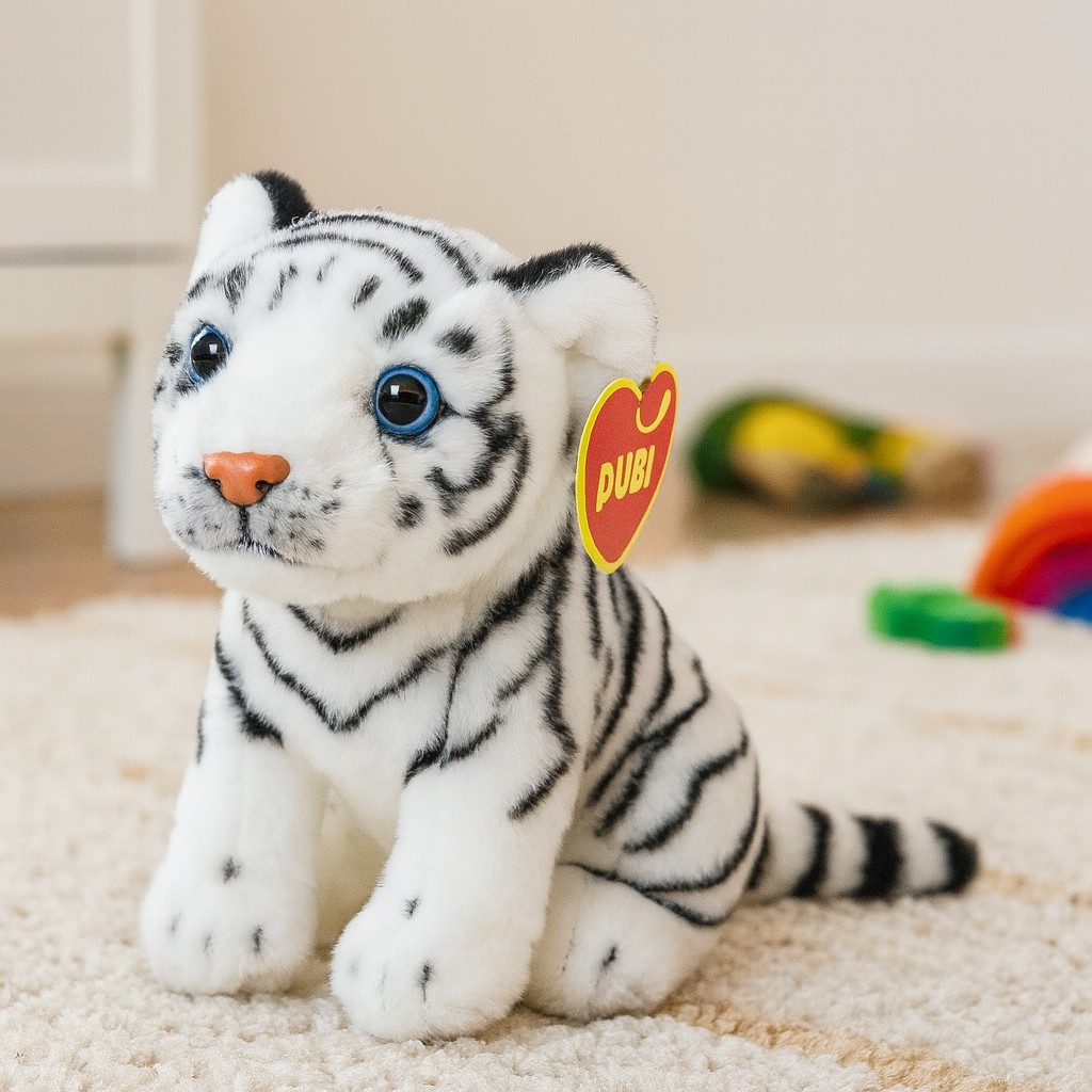 Pluszowy biały tygrys o wysokości 20 cm to idealna zabawka dla każdego miłośnika dzikich zwierząt. Jego miękkie futerko, wyjątkowe czarne prążki i niebieskie oczy sprawiają, że wygląda niezwykle realistycznie, a jednocześnie zachowuje urok przytulanki. Wykonany z wysokiej jakości materiałów, maskotka jest bezpieczna nawet dla najmłodszych dzieci. Tygrys siedzi stabilnie, co sprawia, że idealnie prezentuje się również jako dekoracja dziecięcego pokoju.