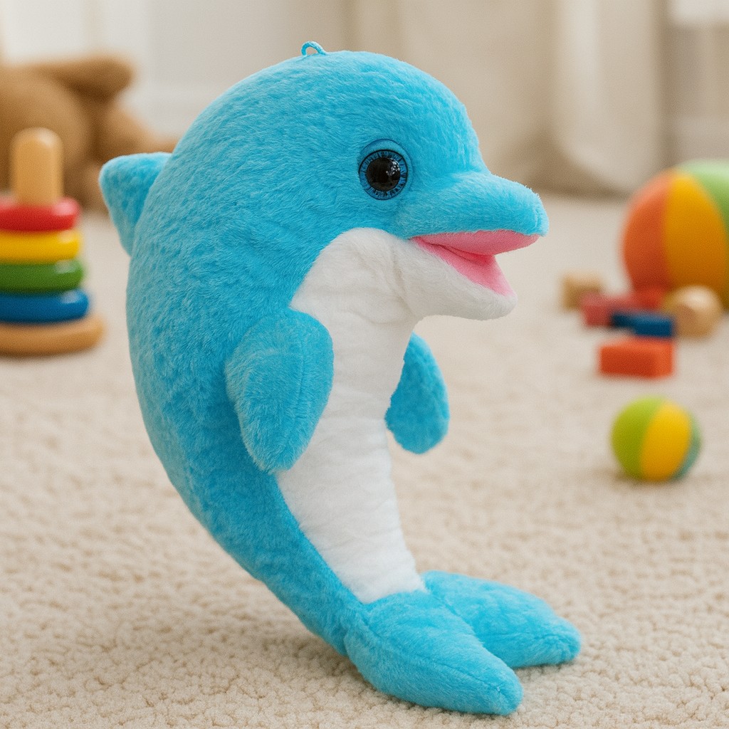 Maskotka delfina o długości 57 cm to wyjątkowa pluszowa zabawka, która przyciąga uwagę swoim żywym, niebieskim kolorem i sympatycznym wyglądem. Mięciutkie futerko oraz biały brzuszek sprawiają, że maskotka jest niezwykle przyjemna w dotyku i idealnie nadaje się do przytulania. Duże, błyszczące oczy nadają jej uroku, a starannie wykonane detale czynią ją atrakcyjną nie tylko dla dzieci, ale także dla dorosłych kolekcjonerów pluszaków.