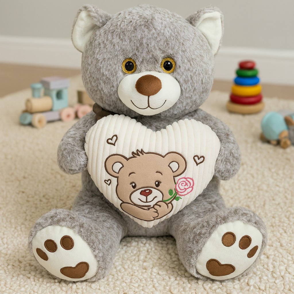 Z tą maskotką dzieci mogą bawić się w dom, opiekę nad misiem, herbatki, teatrzyk lub usypianie pluszowego przyjaciela. Miś może być pacjentem u lekarza, gościem na pikniku albo najlepszym słuchaczem dziecięcych sekretów. Taka zabawa rozwija wyobraźnię, empatię i kreatywność. Szary miś z sercem to nie tylko zabawka – to przyjaciel, który wnosi do codzienności ciepło, radość i mnóstwo uśmiechu! 🐻💖