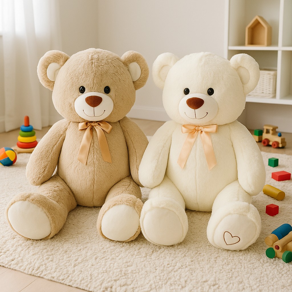 Te urocze misie w kolorze ciepłego beżu i kremowej bieli mają aż 65 cm wysokości, co sprawia, że są wyjątkowo miękkimi i dużymi przyjaciółmi do tulenia. Wykonane z wysokiej jakości pluszu, zachwycają niezwykłą miękkością i bezpiecznym wypełnieniem, dzięki czemu są odpowiednie nawet dla najmłodszych dzieci. Każdy miś ma elegancką, satynową kokardkę i delikatnie wyszywane serduszko na łapce, dodające im uroku.