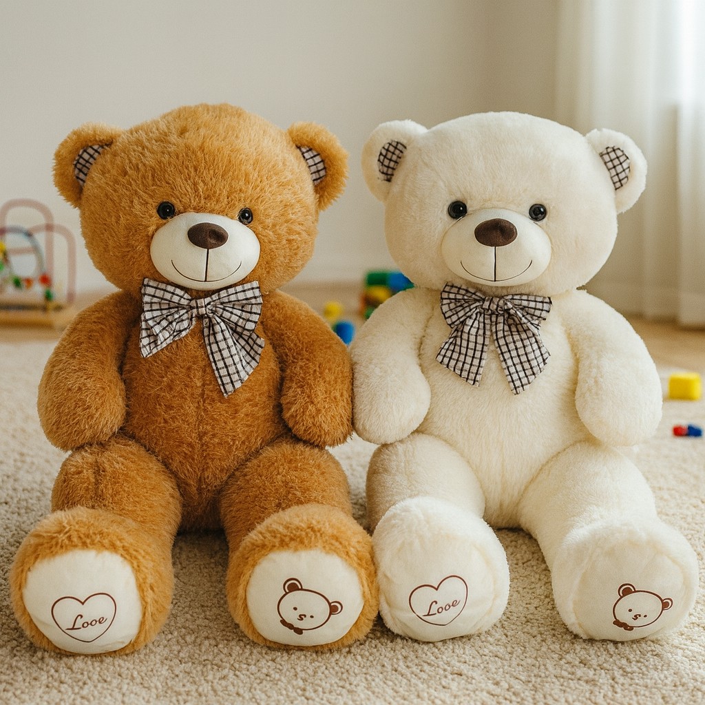 Wyjątkowe misie – jeden w ciepłym karmelowym kolorze, drugi w delikatnym kremowym odcieniu – to idealny zestaw do przytulania i zabawy. Każdy z nich mierzy około 65 cm, ma mięciutkie futerko i elegancką kokardę w kratkę, co sprawia, że są nie tylko zabawką, ale również piękną dekoracją pokoju dziecięcego. Wykonane z hipoalergicznych, trwałych materiałów są bezpieczne dla najmłodszych i łatwe w pielęgnacji – wystarczy delikatne pranie, by na długo zachowały swój urok.