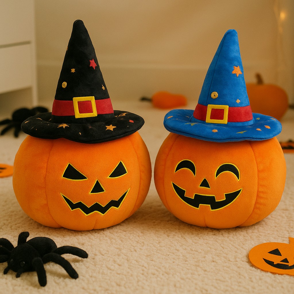 Te dwie pluszowe dynie w czarodziejskich kapeluszach to prawdziwe gwiazdy halloweenowej zabawy! Jedna nosi klasyczny czarny kapelusz ozdobiony kolorowymi wzorkami, a druga – kapelusz w odcieniu nocnego nieba, błękitny z drobnymi gwiazdkami. Ich wesołe, świecące w oczach miny od razu wprowadzają w radosny, psotny klimat październikowych świąt.