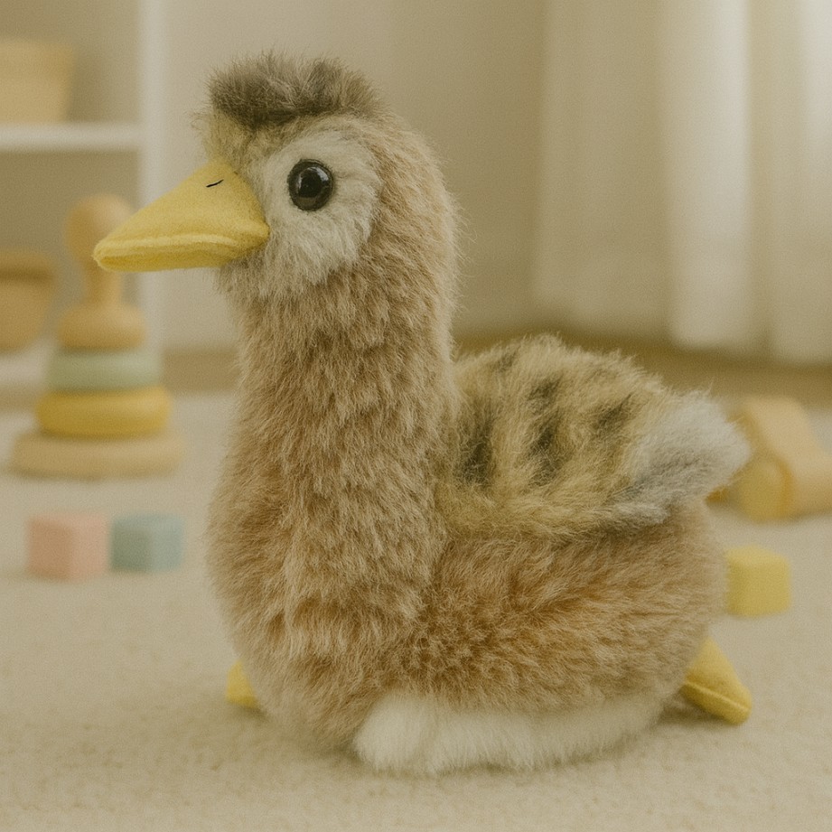 Maskotka pisklęcia kaczki to wyjątkowa propozycja dla dzieci, które uwielbiają miękkie i przyjazne w dotyku pluszaki. Wykonana z puszystej tkaniny o delikatnie dłuższym włosiu, wyróżnia się przyjemną fakturą i naturalnymi kolorami w odcieniach szarości i brązu. Jej wygląd, mimo drobnych nierówności i mniej starannego wykończenia, dodaje autentycznego uroku, sprawiając, że maskotka wygląda wyjątkowo i niepowtarzalnie. Dzięki kompaktowej długości 19 cm jest lekka i poręczna, idealna do przytulania i noszenia w małych dziecięcych rączkach.