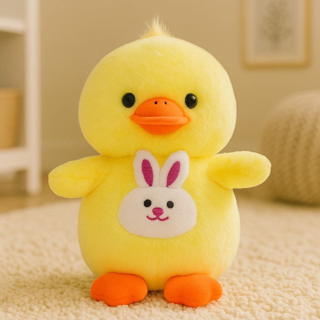 Poznaj uroczą pluszową kaczuszkę, która wniesie w życie dziecka mnóstwo uśmiechu i ciepła! Ta słoneczno-żółta maskotka z pomarańczowym dziobkiem i maleńkim króliczkiem na brzuszku to idealny prezent dla najmłodszych – delikatna, przyjemna w dotyku i w pełni bezpieczna. Jej miękkie futerko zachęca do przytulania, a uroczy design sprawia, że natychmiast przyciąga uwagę i podbija serca dzieci.