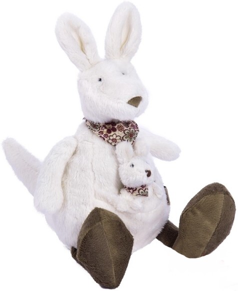 Wysokiej jakości maskotka kangurzycy z maleństwem. Pluszaki wykonane z krótkiego włosia. Zwierzątka udekorowane są chustami zawieszonymi na szyi.