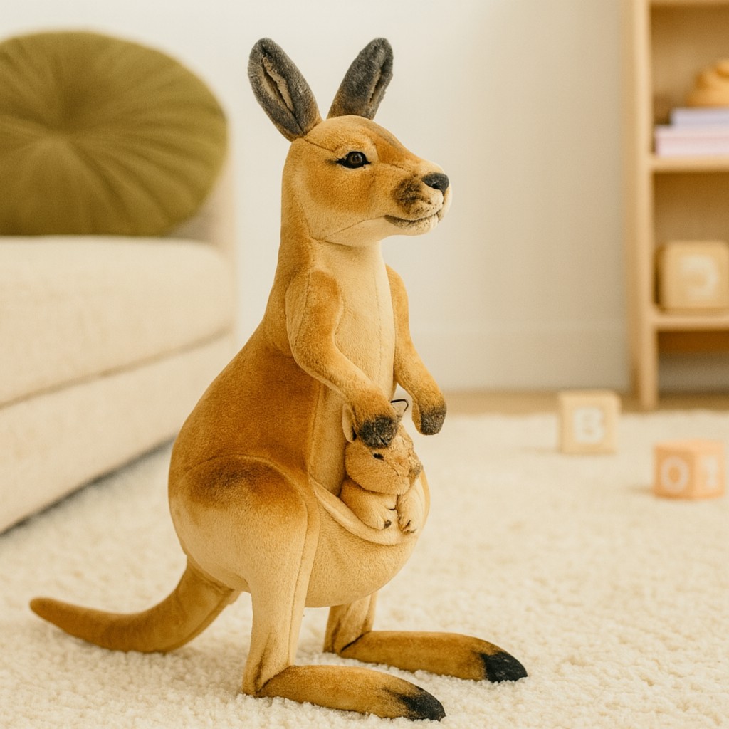 Przedstawiamy uroczą pluszową kangurzycę z maleńkim kangurzątkiem w torbie – duet, który podbije serca dzieci i dorosłych! Ta wyjątkowa maskotka zachwyca ciepłym, miodowo-brązowym kolorem i mięciutkim futerkiem, które aż prosi się o przytulenie. Wygląda tak, jakby zaraz miała podskoczyć – ale spokojnie, zostanie na swoim miejscu, by towarzyszyć w każdej przygodzie!