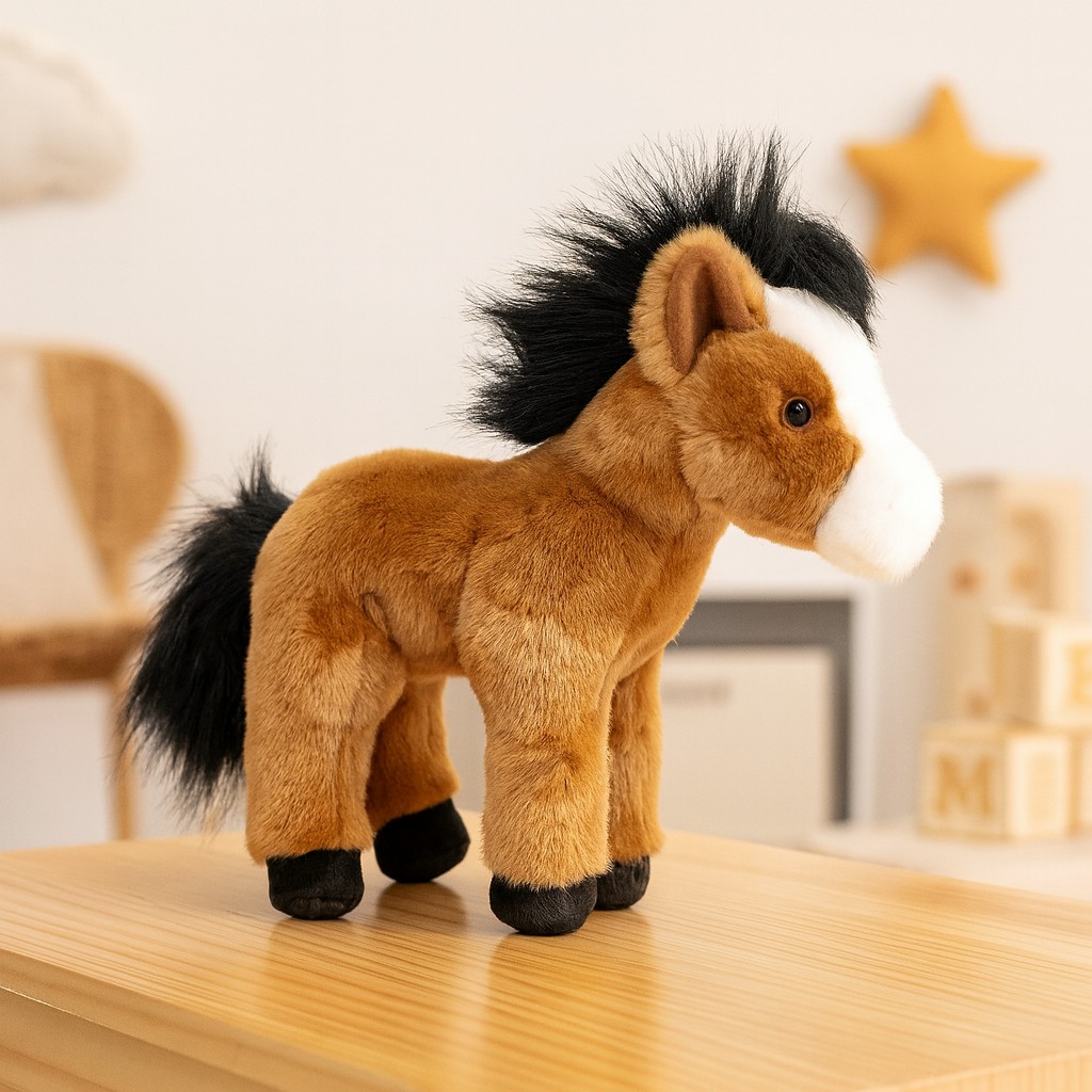 Poznaj uroczego pluszowego konika, który galopem wbiegnie do dziecięcego serca! Jego miękkie, brązowe futerko, czarna grzywa i biała łyska na pyszczku sprawiają, że wygląda niezwykle przyjaźnie i realistycznie. Ten pluszowy rumak to idealny towarzysz zabaw, podróży i drzemek. Nie wymaga stajni ani owsa – wystarczy trochę miłości i miejsca na półce lub w ramionach małego opiekuna.