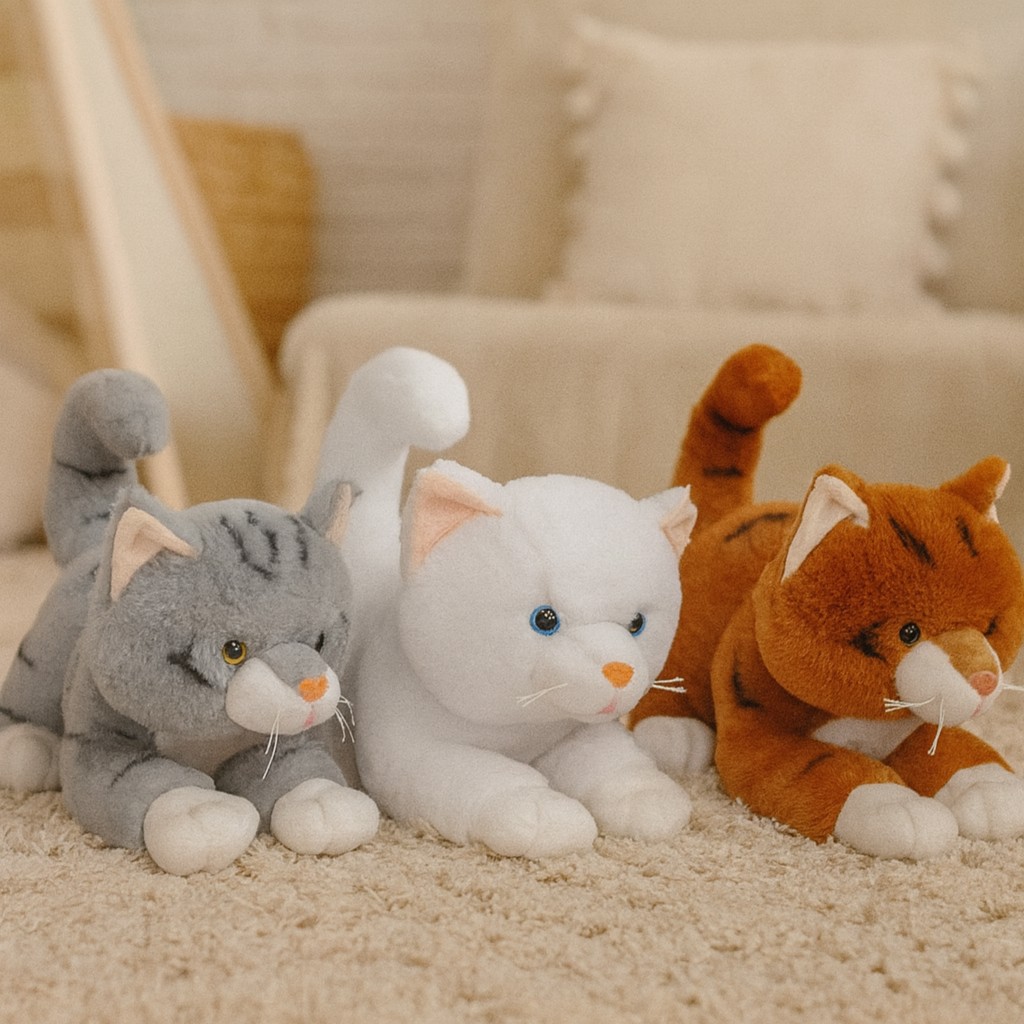 Kto powiedział, że koty chodzą własnymi ścieżkami? Nasze pluszowe kotki są gotowe, by wskoczyć prosto w ramiona swojego nowego właściciela! Mięciutkie, urocze i zawsze gotowe do przytulania – to idealni towarzysze zabaw i drzemek. Występują w trzech kolorach: szarym, białym i rudym, dzięki czemu każdy znajdzie swojego ulubieńca. Ich puchate futerko, uniesione ogonki i słodkie pyszczki sprawiają, że trudno im się oprzeć!
