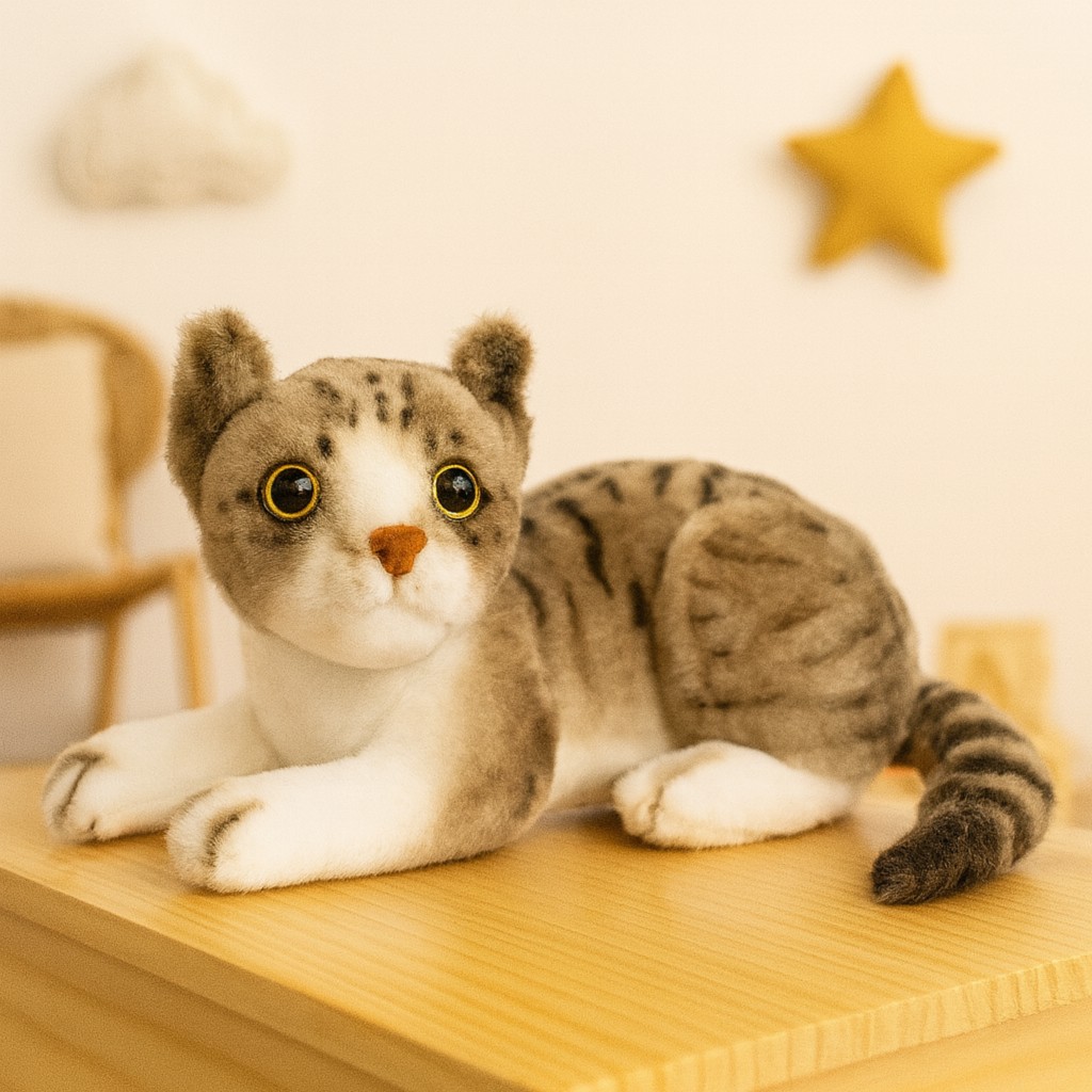 Ten uroczy pluszowy kotek pręgowany wygląda jak prawdziwy mały kociak, który właśnie ułożył się do drzemki! Jego miękkie futerko w odcieniach szarości i beżu, duże, błyszczące oczy oraz słodki pyszczek sprawiają, że nie sposób oderwać od niego wzroku. To maskotka, która wniesie do każdego domu odrobinę ciepła, spokoju i dziecięcej radości.