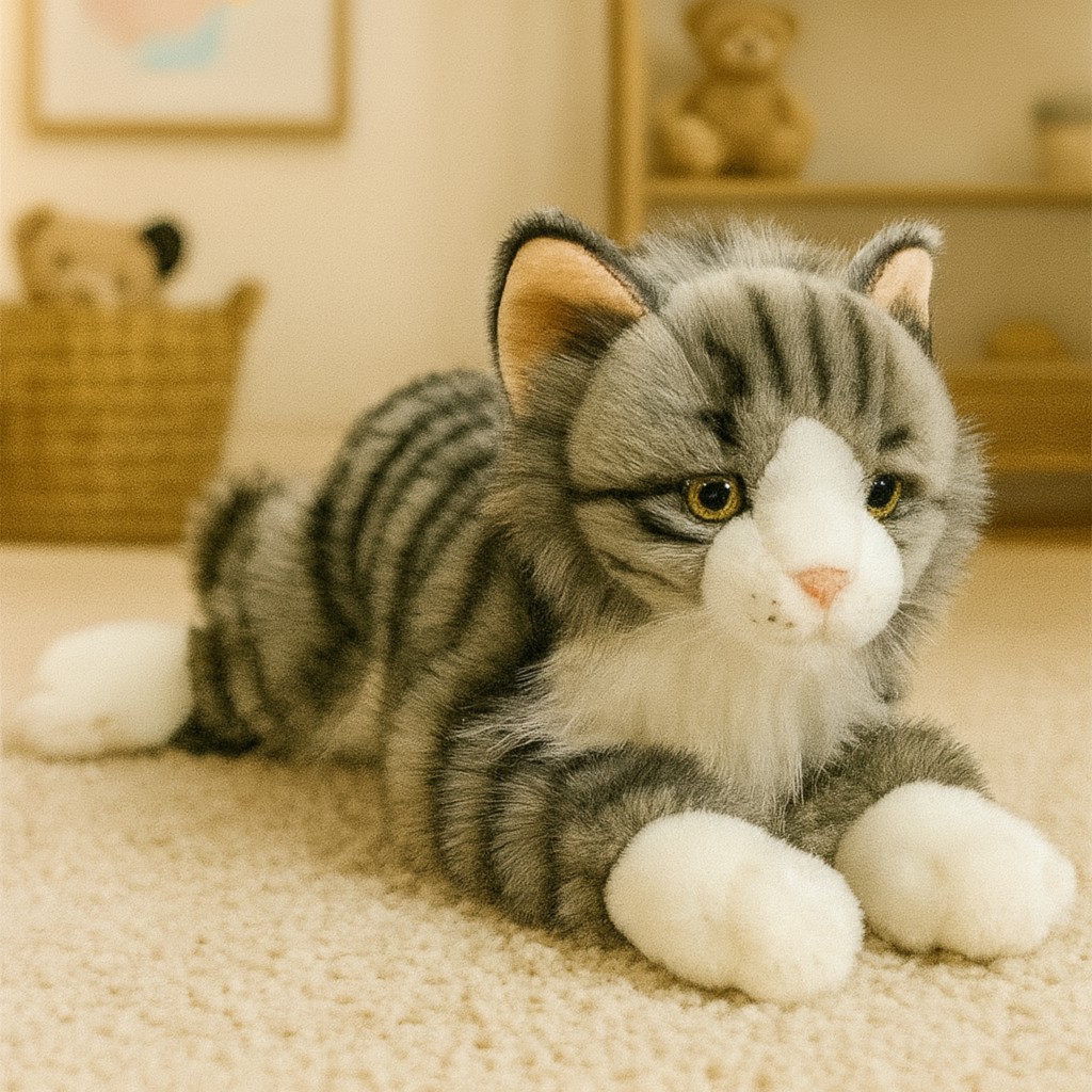 Poznaj uroczego Kotka Mruczka, który wygląda jak prawdziwy koci przyjaciel! Ten piękny pluszak o pręgowanym futerku zachwyca realistycznym wyglądem i miękkością, której nie sposób się oprzeć. Zawsze gotowy na przytulanie, zabawę i popołudniową drzemkę, Mruczek stanie się ulubionym towarzyszem każdego dziecka – a może nawet całej rodziny!