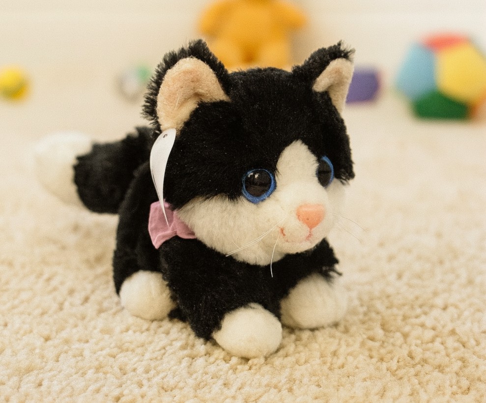 Przeurocza pluszowa maskotka kotka z puszystym ogonem.