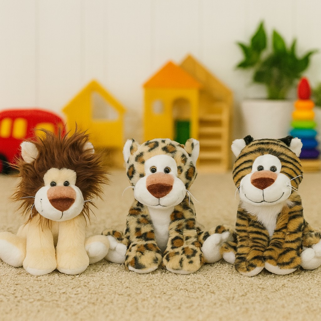 Poznaj niezwykłą trójkę pluszowych przyjaciół: odważnego lwa z bujną grzywą, zwinnego lamparta w cętkach oraz uśmiechniętego tygrysa w prążki. Każda z tych maskotek ma swój niepowtarzalny charakter, a razem tworzą wyjątkową paczkę, która przeniesie dzieci w sam środek dżungli pełnej przygód.