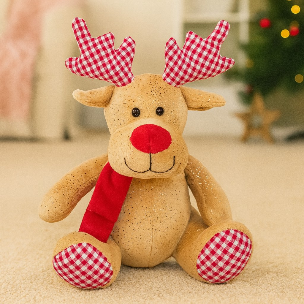Pluszowy Renifer w Kratkę – Świąteczny Przyjaciel z Czerwonym Noskiem!