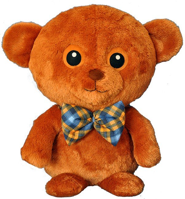 Nietypowy miś o wielkości 50cm. Pluszak posiada charakterystyczne, duże oczy i kokardę w kolorową kratkę.