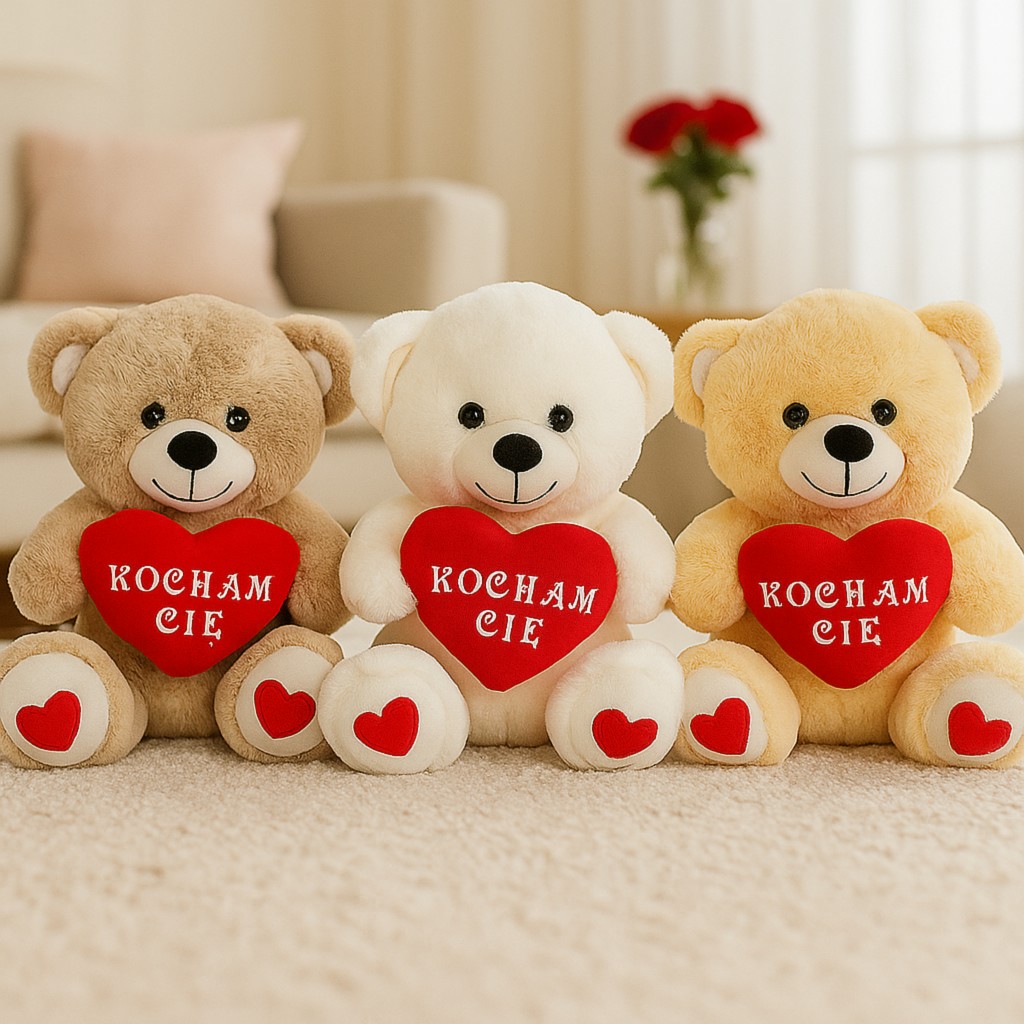 Ten uroczy pluszowy miś z serduszkiem „Kocham Cię” to klasyka, która nigdy nie wychodzi z mody! Idealny na prezent dla ukochanej osoby, dziecka lub przyjaciela. Jego mięciutkie futerko, przyjazny pyszczek i czerwone serce z napisem „Kocham Cię” sprawiają, że od razu wywołuje uśmiech i ciepłe uczucia. Dostępny w trzech kolorach – beżowym, białym i jasnobrązowym – pozwala dopasować maskotkę do gustu obdarowanej osoby.