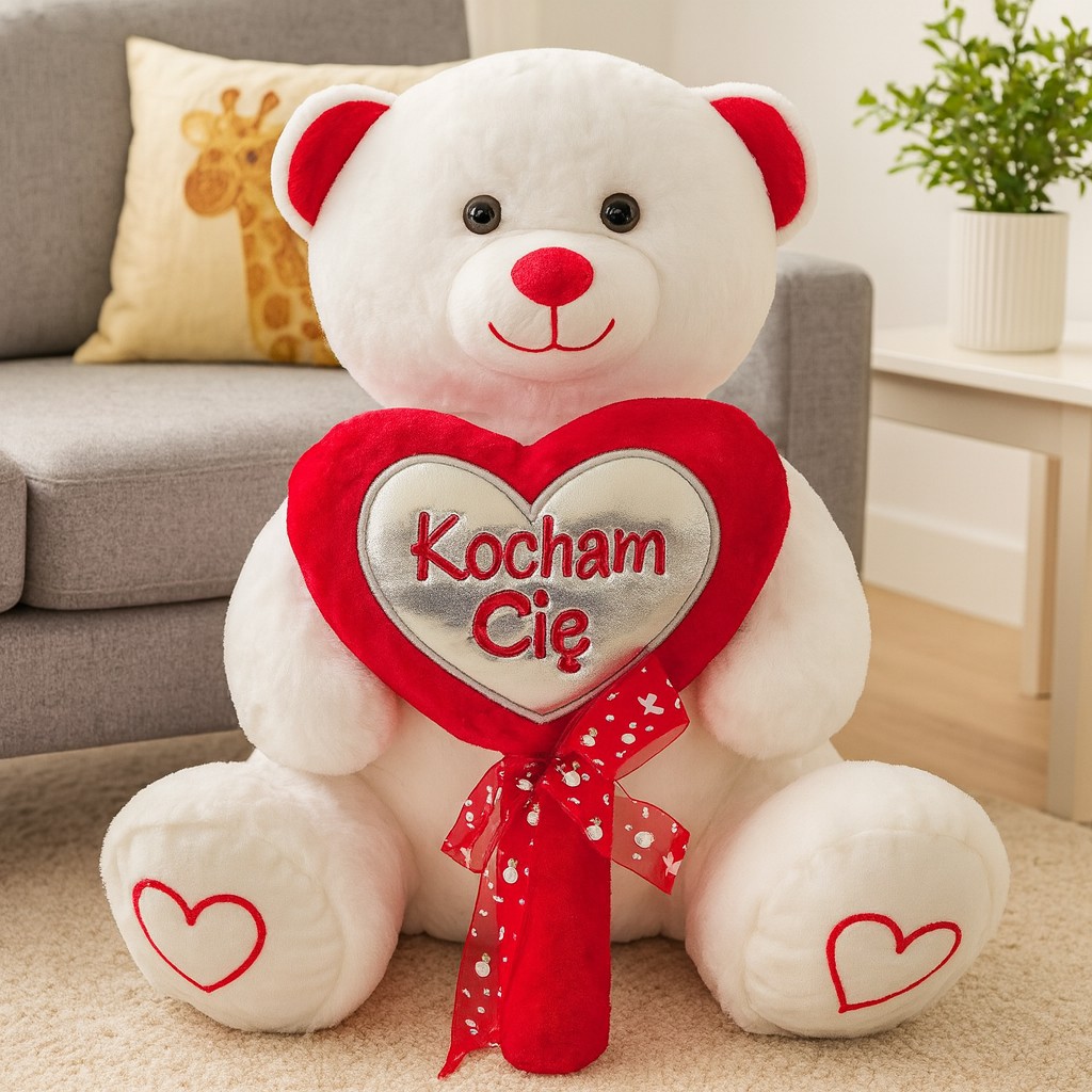Poznaj najmilszego ambasadora uczuć – białego pluszowego misia z czerwonym serduszkiem i napisem „Kocham Cię”! Ten słodki bohater miękkości i przytulności to idealny prezent dla ukochanej osoby – niezależnie od wieku! Jego ciepły uśmiech, błyszczące oczka i mięciutkie futerko sprawią, że nikt nie oprze się jego czarowi. To maskotka, która nie tylko ozdobi pokój, ale też rozgrzeje serce i wywoła szczery uśmiech.