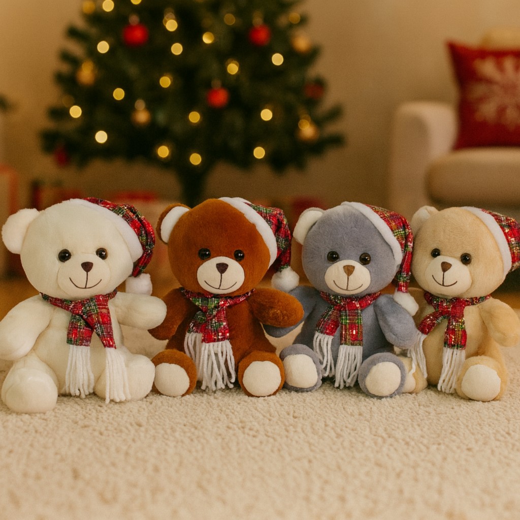 Poznaj naszych czterech uroczych bohaterów – mięciutkie, przytulne misie w świątecznych czapeczkach i szalikach! Każdy z nich ma swój niepowtarzalny kolor i osobowość – biały jak świeży śnieg, brązowy jak piernik, szary jak zimowe niebo i kremowy jak ciepłe kakao. Razem tworzą wesołą gromadkę, która wprowadzi świąteczną atmosferę do każdego domu.