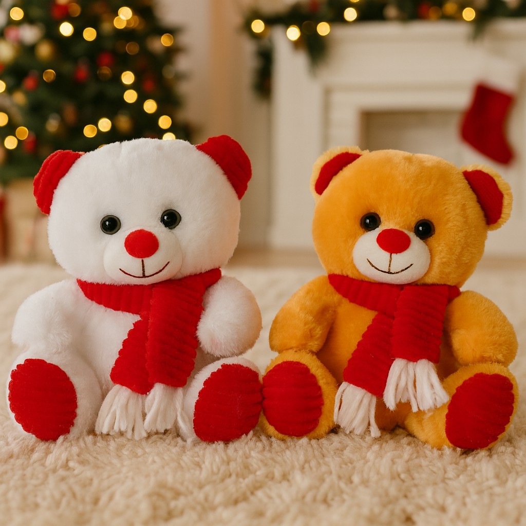 Poznaj urocze misie, które rozgrzeją każde serce w chłodne zimowe wieczory! Te dwa puszyste przytulaki – biały i miodowo-złoty – w czerwonych szalikach wyglądają tak, jakby właśnie przybyły z zimowej bajki prosto pod Twoją choinkę. Mięciutkie futerko, błyszczące oczka i promienny uśmiech sprawiają, że trudno oderwać od nich wzrok. Każdy miś jest wykonany z delikatnego, miłego w dotyku materiału, który zachęca do niekończącego się przytulania.