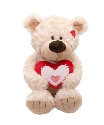 Sympatyczny, wesoły miś w kolorze ecru, a w rączkach trzyma serduszko.