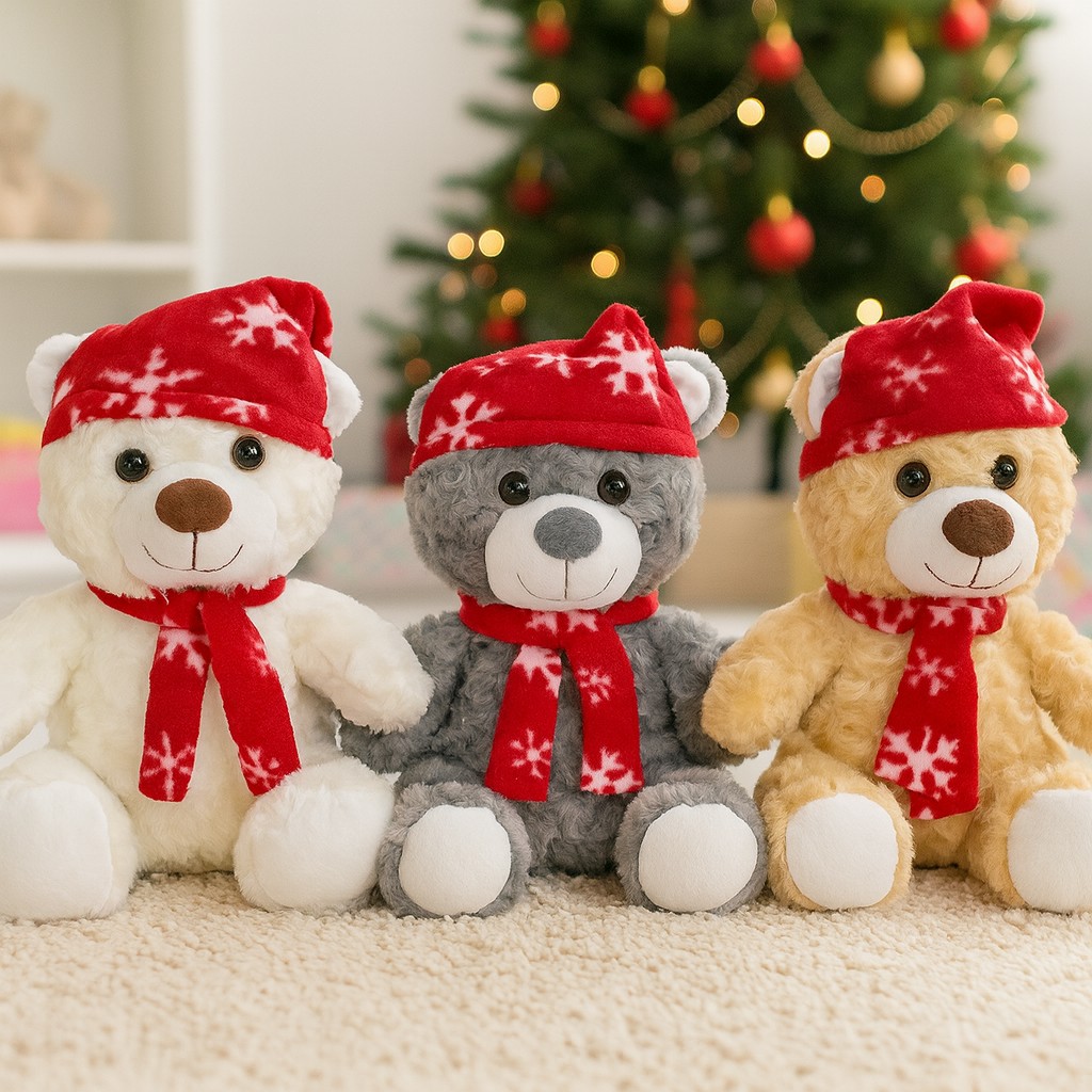 Poznaj naszą wesołą gromadkę pluszowych bohaterów – Świąteczne Misie w czapkach i szalikach z płatkami śniegu! Te urocze pluszaki występują w trzech kolorach: kremowym, szarym i miodowym – każdy z nich ma swój niepowtarzalny charakter, ale razem tworzą idealny zestaw świątecznej radości. Ich mięciutkie futerko, przyjazne uśmiechy i zimowe akcesoria sprawiają, że trudno im się oprzeć.