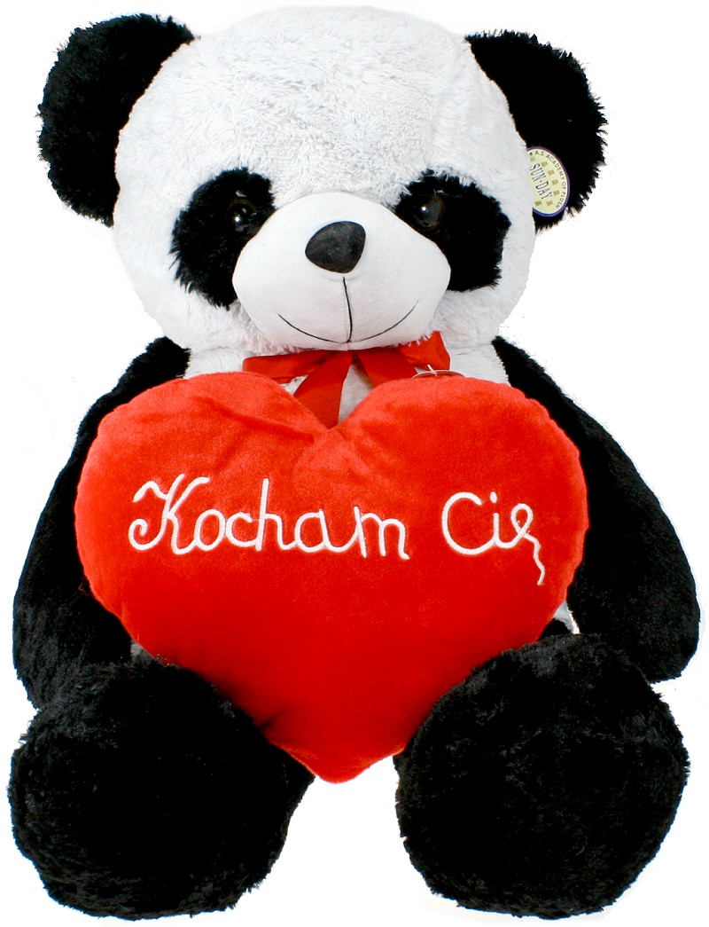 Świetny, milutki misiu panda o wielkości 90cm (siedząc ok. 60cm). Ten zwierzak ma słodkie oczka, przyjemne futerko i super kokardę! Jest mięciutki i idealny do przytulenia! Maskotka posiada poduszkę serce w zestawie.