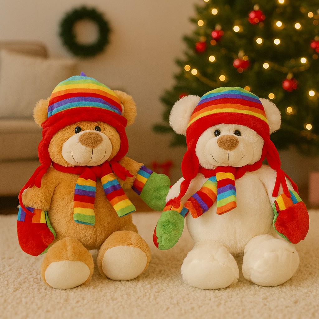 Poznaj dwa wesołe misie, które wprowadzają do świątecznego świata prawdziwą tęczę radości! Ubrane w kolorowe czapeczki, szaliki i rękawiczki, wyglądają jak mali podróżnicy prosto z zimowej bajki. Jeden w karmelowym futerku, drugi w śnieżnobiałym – razem tworzą duet, który rozweseli każde wnętrze i sprawi, że święta będą jeszcze bardziej magiczne.
