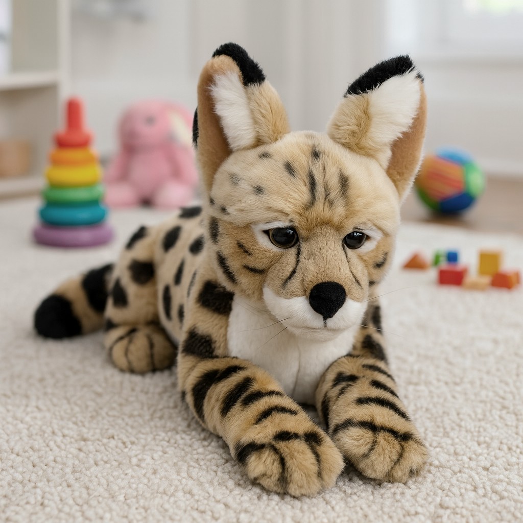 Maskotka w kształcie serwala to niezwykle realistyczna i efektowna przytulanka, która zachwyca swoim wyglądem. Jej futerko zostało wykonane z miękkiego materiału, a charakterystyczne cętki oraz duże uszy nadają jej autentycznego wyglądu. Dzięki długości około 45 cm maskotka jest na tyle duża, aby stać się ważnym elementem zabawy, a jednocześnie lekka i poręczna, by dziecko mogło ją wszędzie ze sobą zabierać.
