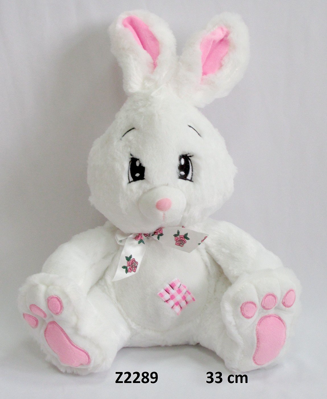 Milutki pluszak. Zajączek posiada uroczą kokardę, łatkę na brzuszku i zabawne uszka.
